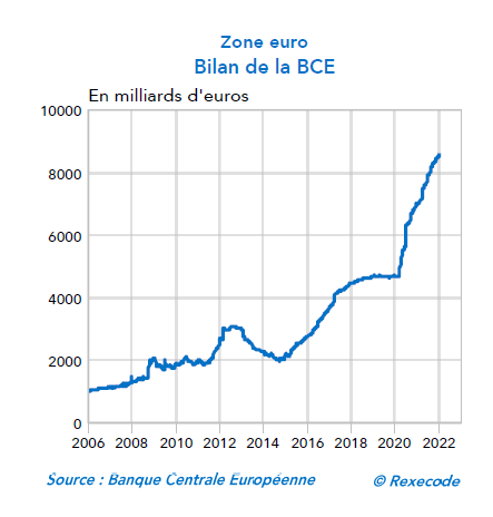 Le bilan de la BCE a grimpé de plus de 3.000 milliards d’euros depuis le début de la crise du Covid, en passant de 5.000 à plus de 8.000 milliards d’euros. Il s’agit littéralement d’argent créé ex nihilo, par un jeu d’écriture, afin de souscrire les emprunts émis par les États faisant face aux gigantesques déficits provoqués par la pandémie. Il y avait déjà eu ce qu’on appelle « la planche à billets » auparavant, lors de la crise des subprimes de 2008, puis à l’occasion de la crise de la dette grecque en 2011, mais la période actuelle les dépasse de loin. Le total du bilan de la BCE équivaut à 81% du PIB de l’Eurozone, contre 37% pour la Fed, 41% pour la Banque d'Angleterre. Seule la Banque du Japon fait plus (134%), mais la dette est détenue en totalité en interne, ce qui change la donne. La hausse vertigineuse à laquelle nous assistons n’est pas près de s’arrêter étant donné que les déficits budgétaires en France et dans les pays d’Europe du Sud restent élevés et se résorbent lentement.
